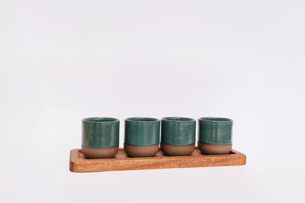 4 copos com capacidade de 150ml cada, com 7cm de altura e 7cm de diâmetro e bandeja em madeira Canelão medindo 34x10,5cm;